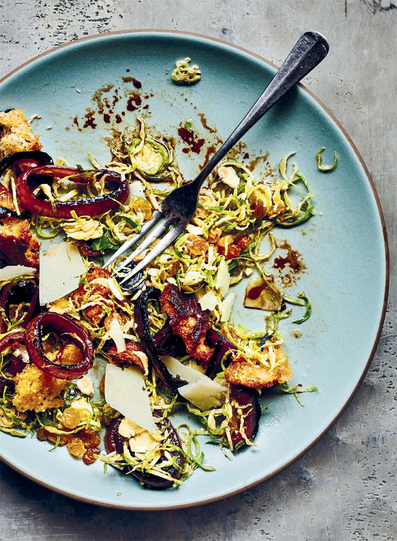 - In a large bowl, combine the raisins and about half of the vinaigrette. Let the raisins soften for 15 minutes. Add the bread bits, brussels sprouts, salt, and pepper and give everything a good toss. Let the mixture sit for a minute or two so the bread softens. Put it Together and Serve