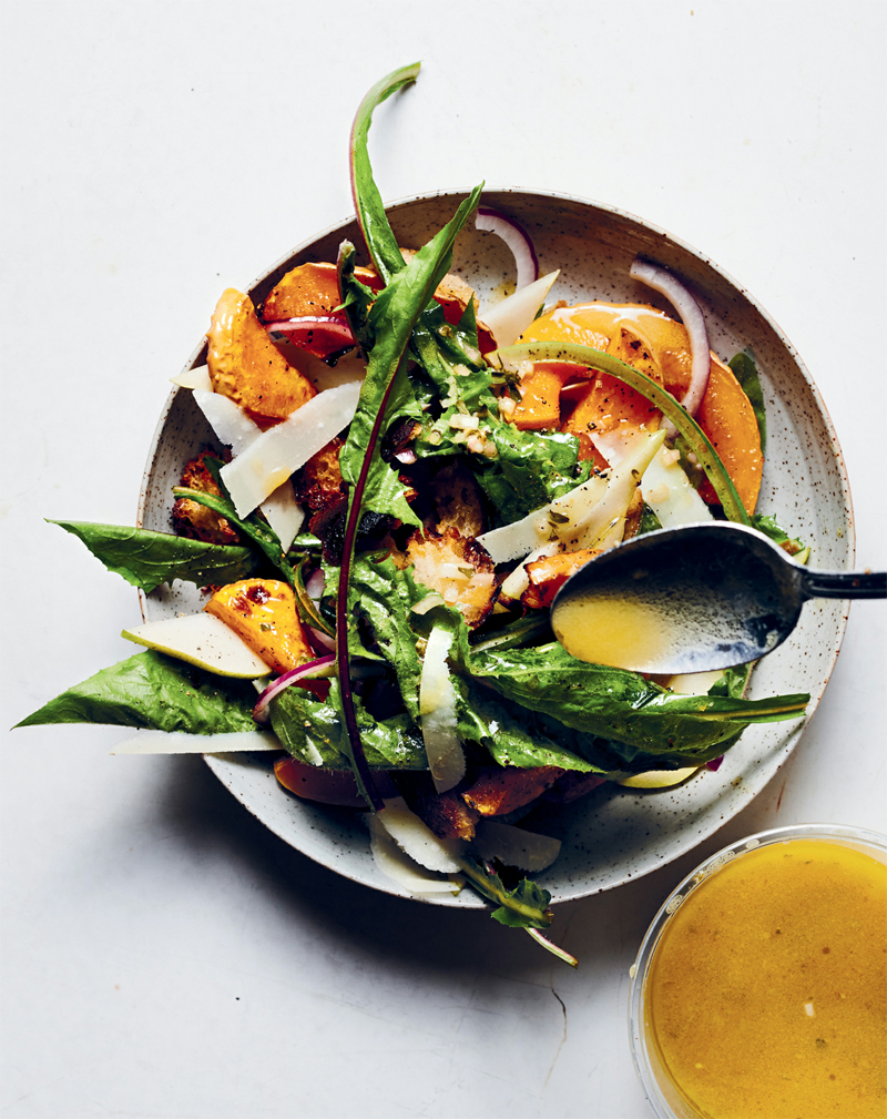 - Add the squash, onion, pear, greens, cheese, salt, and pepper to the bread and give the salad a good but gentle toss, being careful not to break up the squash too much. Taste and, if desired, add the remaining vinaigrette and toss again or serve the dressing on the side.