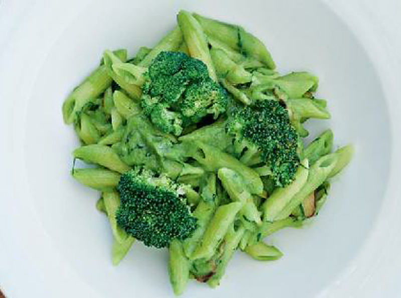 - Bring to a boil Penne in a large number of generously salted boiling water. At the same time in a deep frying pan with a thick bottom olive oil saute the garlic, sprig of thyme, the shallots and shiitake, 3 min. Add broccoli puree,stir, warm. If sauce is very thick, add water from the boiling pasta.