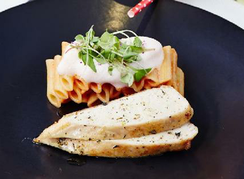 - Penne pasta is ready drain in a colander, shake off excess water, place pasta in saucepan with sauce, mix and serve together with the chicken.