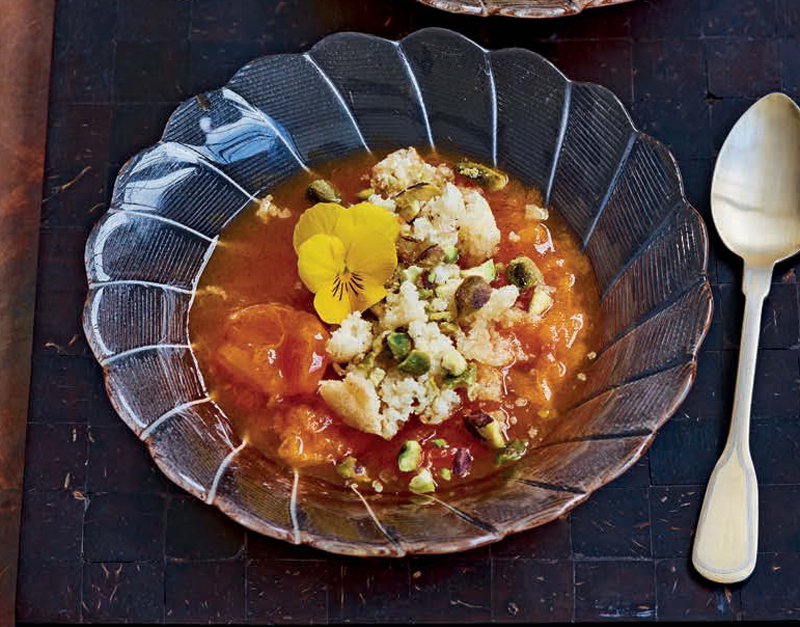 - Just before serving, roughly crumble the Amaretti biscuits and use them to cover the bottom of 4 serving glasses or ramekins. Spoon the persimmon mixture over the biscuits, top with a little more crushed biscuits, the crushed pistachio nuts and an edible flower if you wish, and serve.