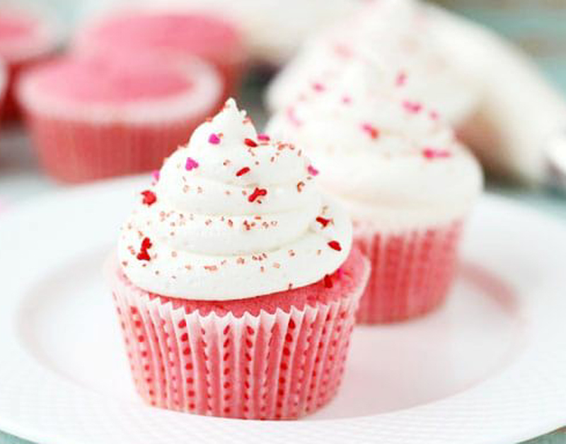 - Mix in red/pink food colouring with cream cheese until a light pink colour is achieved. Use this to top cupcakes.