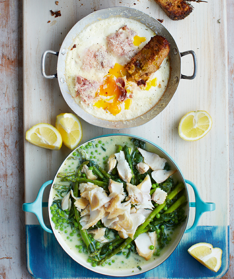 - Trim and roughly slice the spring onions, then put into the casserole pan with 1 tablespoon of olive oil. Trim the asparagus and add, along with the mint sauce, flour, milk, peas, spinach and a pinch of salt and pepper, then put the lid on and simmer, correcting the seasoning at the end. Pop the fish into the medium pan, cover with boiling water and simmer gently (roughly 6 minutes). When everything’s ready, flake the fish over the veg, then serve with lemon wedges, the coddled eggs and crispy tomato loaf.