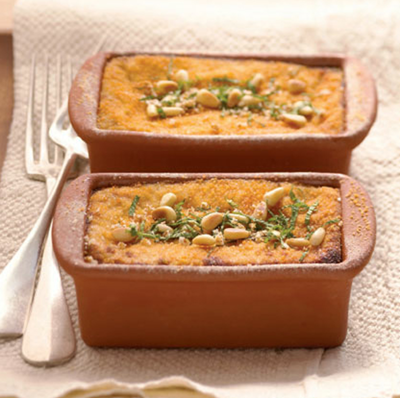 - Butter a clay pot or baking dish or four 4-ounce ramekins, and pour the mixture into it. Top with the pulverized lentils, spray them with a little olive oil, and bake for 30 minutes, until the top turns crispy brown. Remove and top with the mint and the pine nuts. Be sure to pass some extra tangerine or coarse sea salt for guests to add at the table.