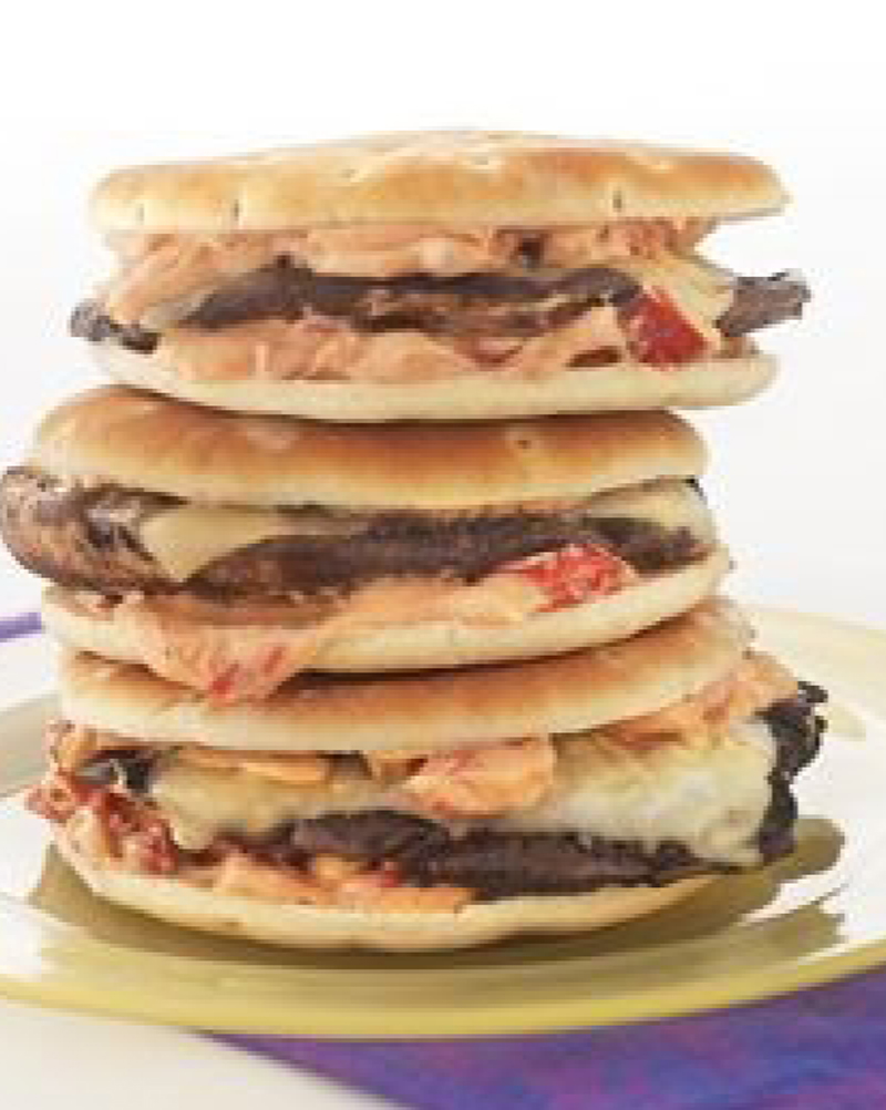 - Spread 2½ tablespoons Smoky Red Pepper Mayo evenly on cut sides of each sandwich thin. Place a mushroom cap, cheese side up, on bottom of each sandwich thin. Top with sandwich thin tops.