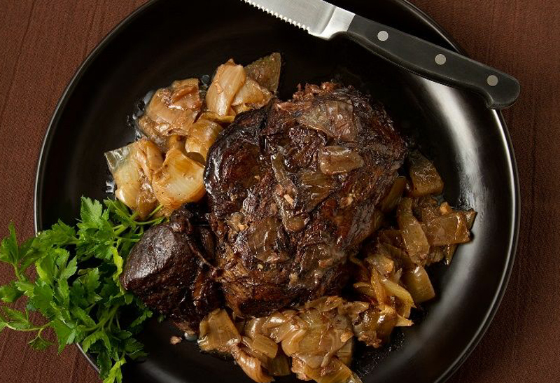 - Add in the chopped red onion, minced garlic and minced ginger. Stir well to mix. Cook for 5 minutes or until soft. Add the chuck roast back into the pot.