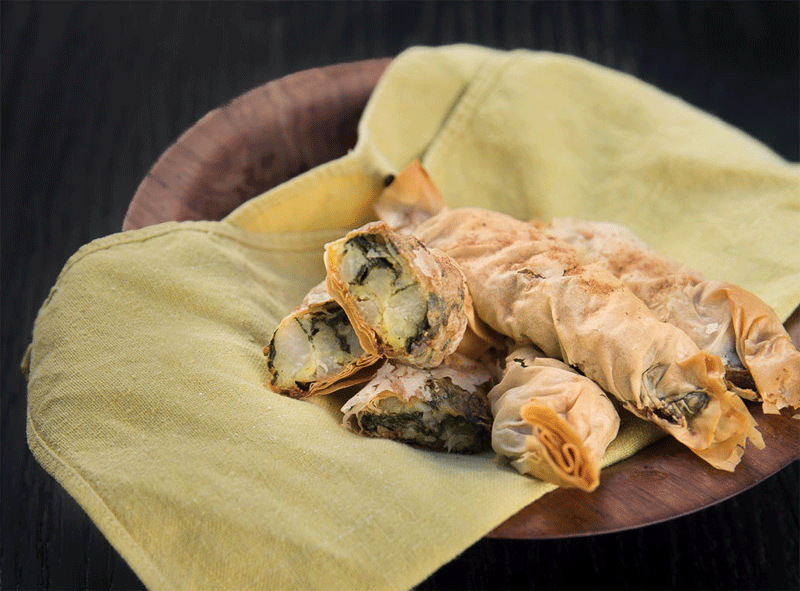 - To fill the phyllo, gently pull 2 layers of the pastry from the stack. Using a pastry brush and the melted butter, generously butter the top layer. Place 1 tablespoon of the filling at the very end of the buttered layer, leaving about 1/4 inch (6 mm) free space on each side of the filling. Roll gently, as you would a cigar, until sealed. Twist the free ends as you would a hard candy wrapper. Place seam side down on a rimmed baking sheet. Continue with the rest until completed, spacing generously. Brush the tops and ends of each lightly with remaining butter and sprinkle lightly with salt. Bake for 30 minutes, or until golden brown. Arrange on a serving platter and serve hot.
