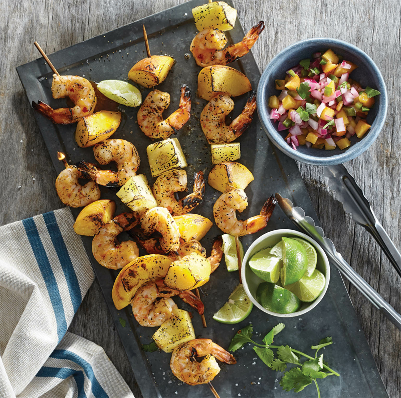 - Alternate 3 prawns, 3 peach quarters and 3 pineapple chunks onto each skewer. Grill over direct heat for about 4 minutes on each side until prawns are opaque. Remove from grill and serve with salsa and lime wedges.