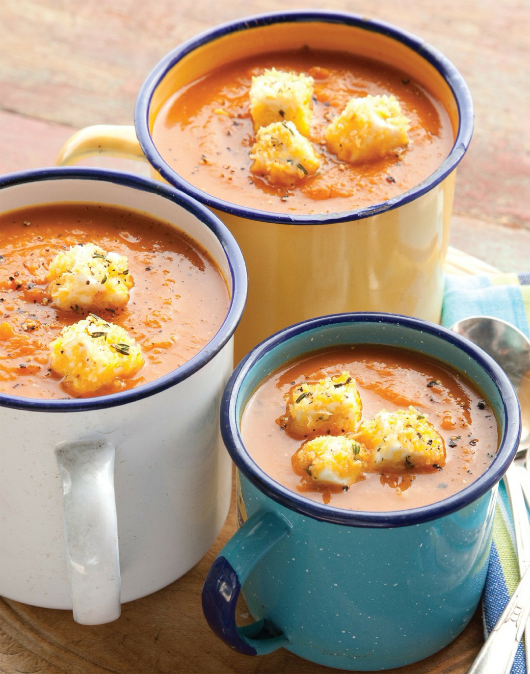 - Ladle the soup into bowls and top with the feta croutons. Feta Cheese Croutons