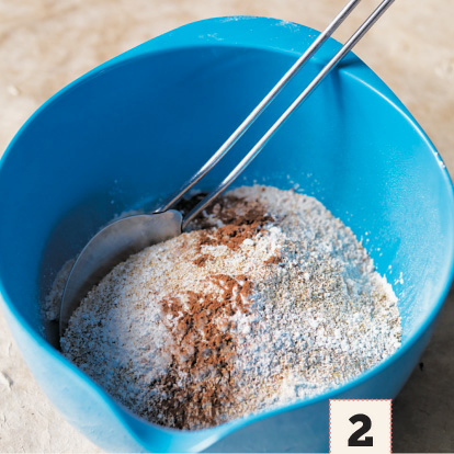 Put the flour, oatmeal, baking powder, bicarbonate of soda, salt and mixed spice into a large bowl and mix to combine thoroughly.