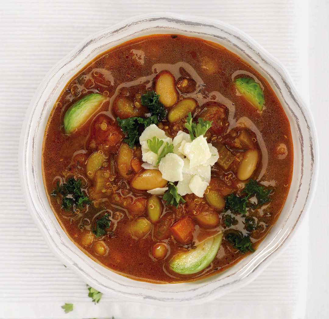 - In a large saucepan, heat oil over high heat and sauté onion, garlic, carrot and celery for a few minutes. Add tomatoes, broth, water, kale and Brussels sprouts. Continue cooking for about 20 minutes.