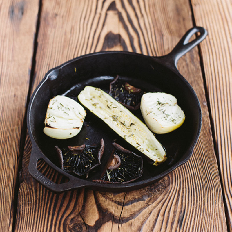 - Place the onion, zucchini slices, and portobellos in a bowl and coat evenly with the cooking fat, rosemary and salt.