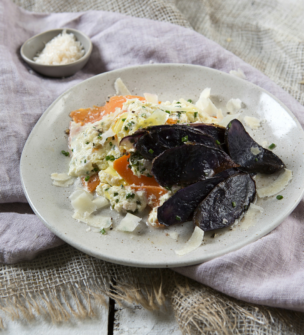 - Beginning with the sweet potato, layer half the slices over the base of the tin in overlapping layers. Scatter with one third of the thyme, then pour over one third of the ricotta mixture. Layer the parsnip over the ricotta, followed by another third of the thyme and ricotta. Add the remaining sweet potato and thyme, then spread with the garlic paste. Pour over the last of the ricotta, then layer the purple potatoes over the top. Place on a baking tray and bake for 25–30 minutes or until the top layer of purple potato is lightly coloured. If time permits, stand for 1 hour before cutting. To serve, spoon onto plates, drizzle with olive oil and scatter with chives.