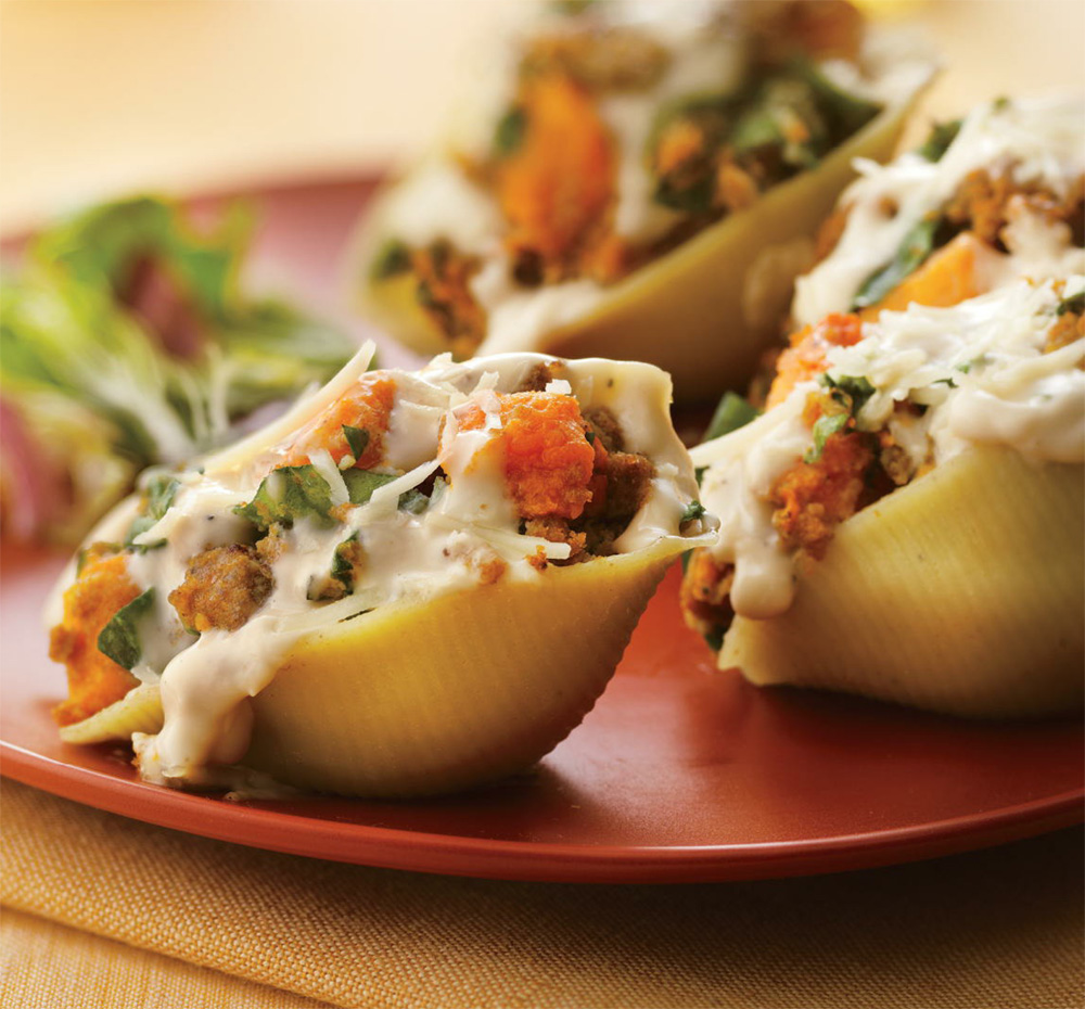 - Spray 13 x 9-inch (3-quart) glass baking dish with cooking spray. Fill each cooked pasta shell with about 3 tablespoons squash mixture; place filled side up in baking dish. Drizzle Alfredo sauce over shells; sprinkle with Parmesan cheese. Cover with foil. Bake 15 minutes. Uncover; bake 5 to 10 minutes longer or until hot.