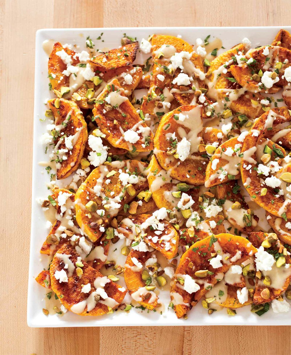 We wanted to kick up the flavor of roasted butternut squash without resorting to a cloyingly sweet or excessively rich treatment. For a more balanced and nutritious approach, we used a light hand with bold-flavored pistachios and briny feta. First, to get perfectly cooked squash, we peeled it to remove not only the tough outer skin, but also the rugged fibrous layer of white flesh just beneath, exposing the vibrant orange, supremely tender flesh full of beta-carotene. To encourage the natural sugars in the squash to caramelize, we used a hot 425-degree oven, placed the squash on the lowest oven rack, and increased the roasting time to evaporate moisture. We added our flavorings: pistachios for crunch and some heart-healthy fat, mint for brightness, and feta for tang and richness. Spiked with a touch of honey and lemon juice, tahini (another good source of healthy fats plus calcium and iron) was the perfect topping and made for a simple, beautiful presentation. This dish can be served warm or at room temperature. For the best texture, be sure to peel the squash thoroughly, removing all of the fibrous flesh just below the skin.