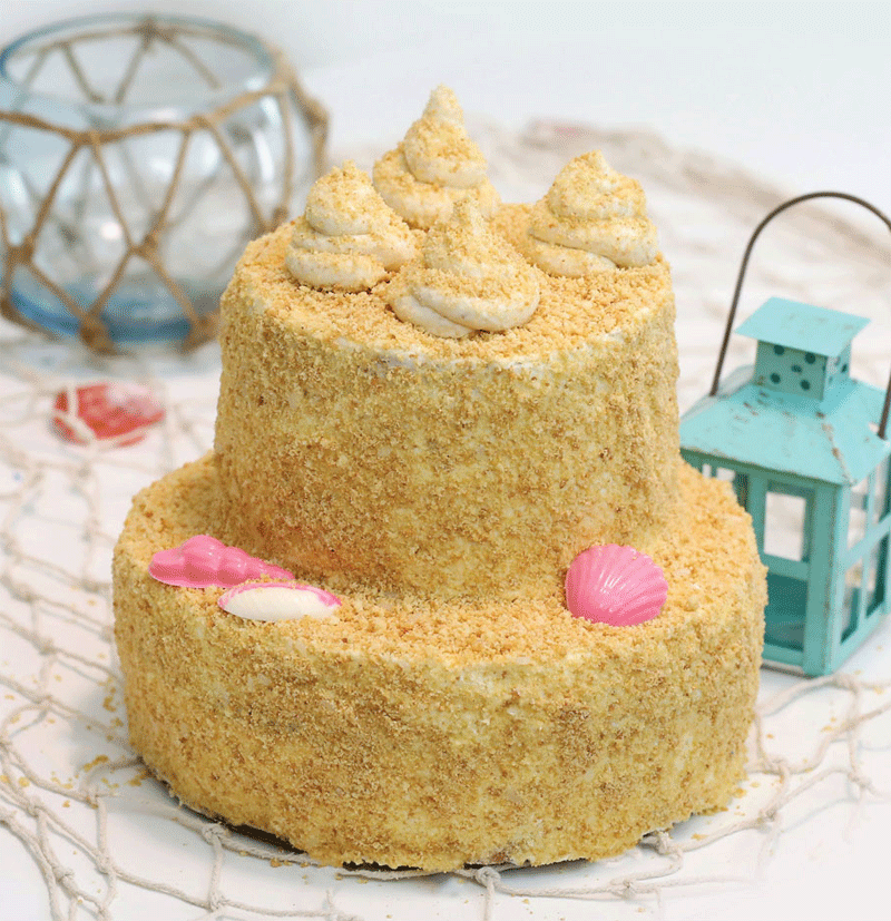 - Coat all cakes in a generous layer of buttercream. Use your hand to press edible sand to the entire surface of all of the cakes.