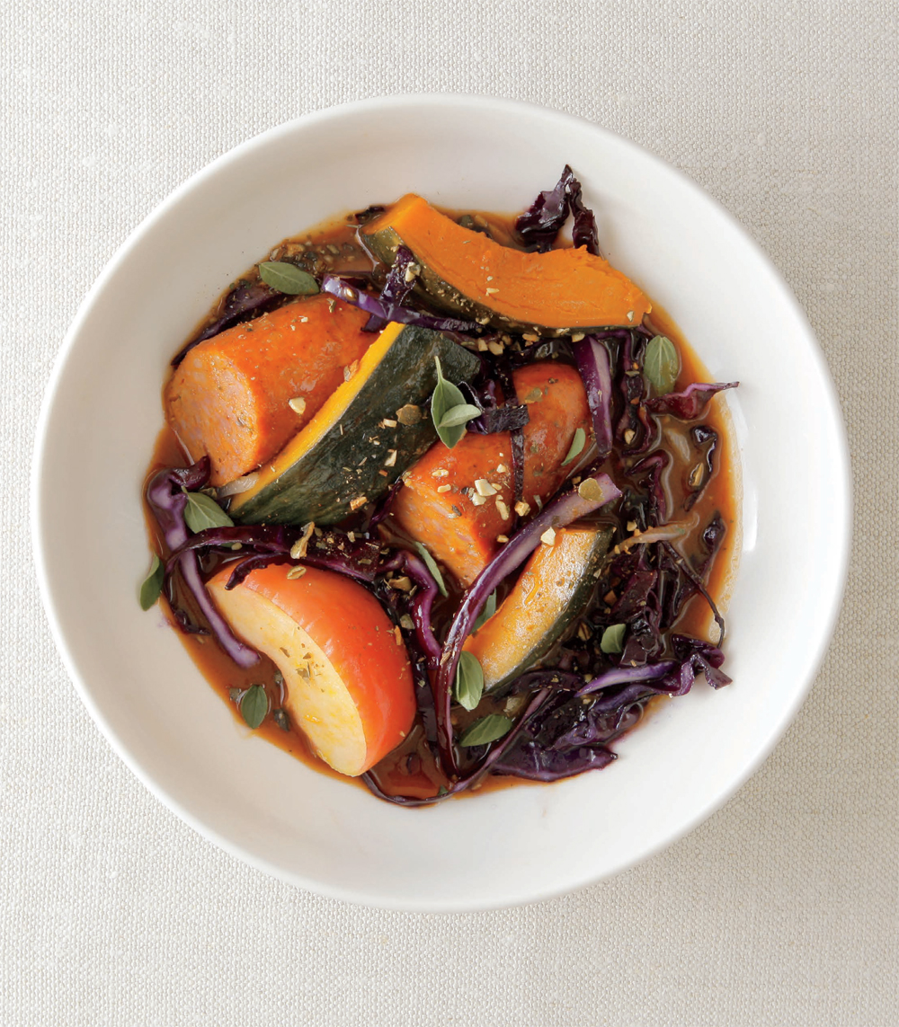 Chorizo is a great shortcut ingredient. It is heavily spiced (paprika, coriander, and cumin, just to name a few) so you don’t have to buy a lot of pricey spices to make this full-flavored stew. Here its flavors are complemented with chunks of creamy squash and wedges of sweet apples. Look for kabocha at farmers’ markets in the late summer and fall. If it’s unavailable, substitute acorn squash. The stew can be made up to three days in advance; store in an airtight container, in the refrigerator.