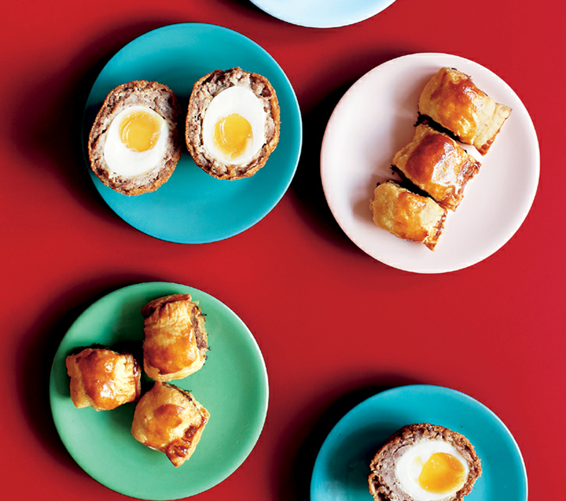 - Take one portion of the sausage meat and flatten on your hand. Coat one cooked egg in flour, then wrap the meat around it, moulding it into a nice egg shape. Make sure there are no holes in the sausage wrapping. Repeat with the rest of the eggs and sausage-meat portions.
