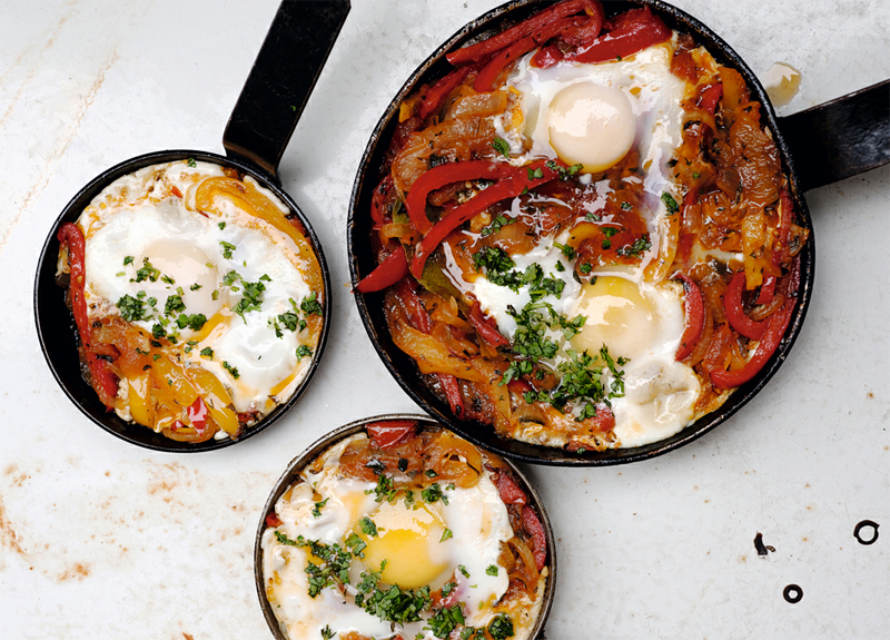 - Remove the bay leaves, then divide the pepper mix among four deep frying pans, each large enough to take a generous individual portion. Place them on medium heat to warm up, then make two gaps in the pepper mix in each pan and carefully break an egg into each gap. Sprinkle with salt and cover the pans with lids. Cook on a very (!) gentle heat for 10 to 12 minutes, or until the eggs are just set. Sprinkle with cilantro and serve.
