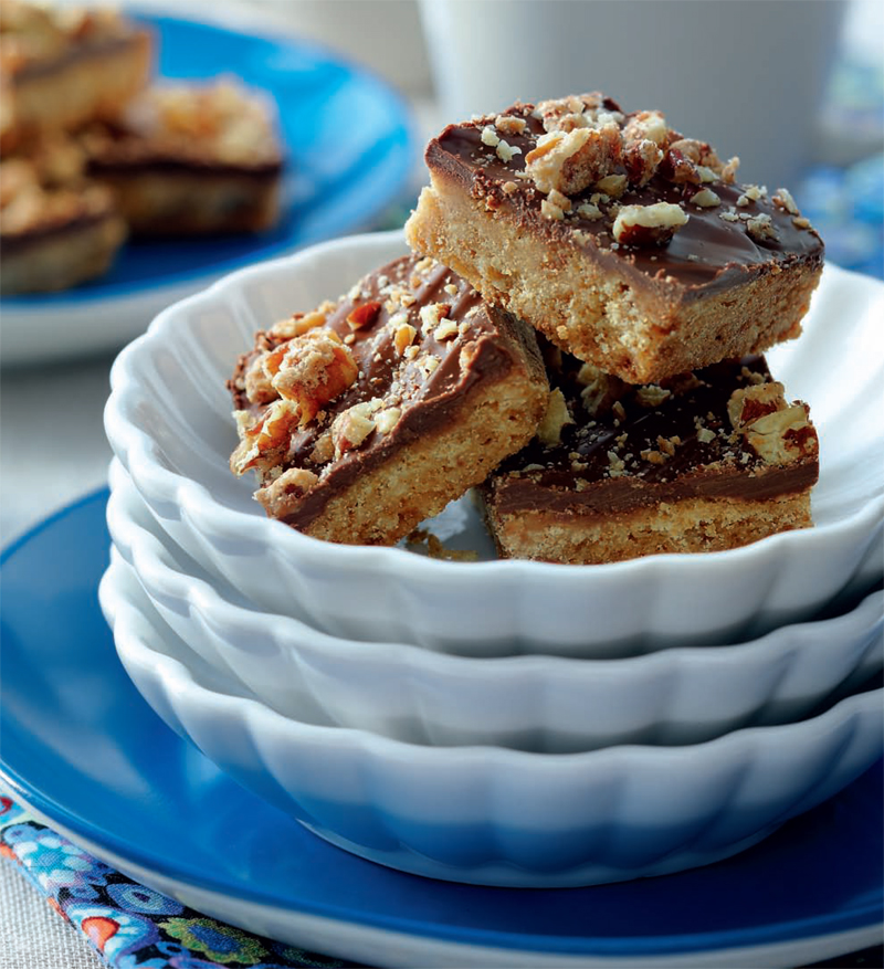 - Remove the shortbread from the oven and sprinkle the chocolate chips over the hot shortbread. Return the shortbread to the oven for 1 to 2 minutes, or just until the chocolate has softened. Remove from the oven and spread the chocolate evenly with a metal spatula. Sprinkle the candied walnuts evenly over the chocolate.