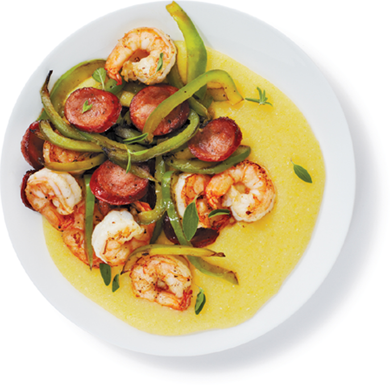 - Cook the sausage in the oil in a large skillet over medium-high heat until browned, 3 to 4 minutes. Add the shrimp, bell pepper, ½ teaspoon salt, and ¼ teaspoon black pepper and cook until the shrimp are opaque, 3 to 4 minutes more. Add the butter and cook until melted.