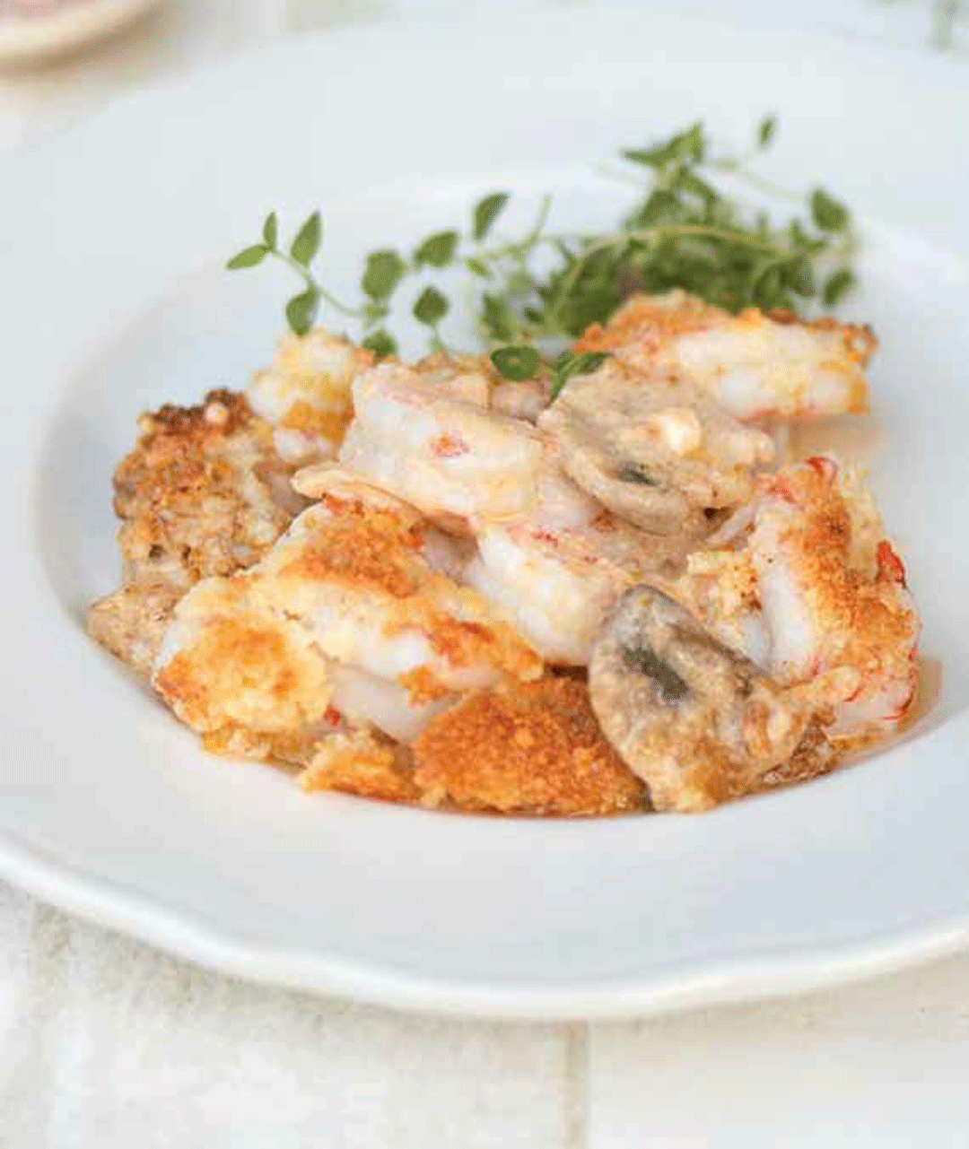 - Melt ½ cup of ghee in a cast-iron skillet over medium-high heat. Add the mushrooms and onions and sauté, stirring occasionally, until the mushrooms are golden brown, about 5 minutes. Add the shrimp and sauté for 4 minutes, until the shrimp are cooked through and no longer translucent.