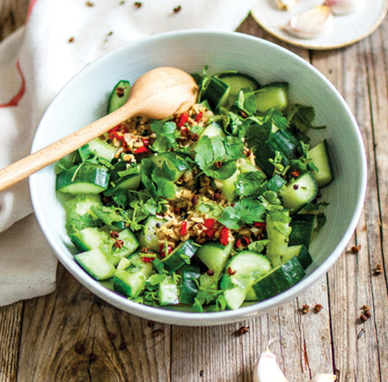 - Pour the hot dressing over the cucumber pieces, leave to cool a little and sprinkle coriander leaves over the top.