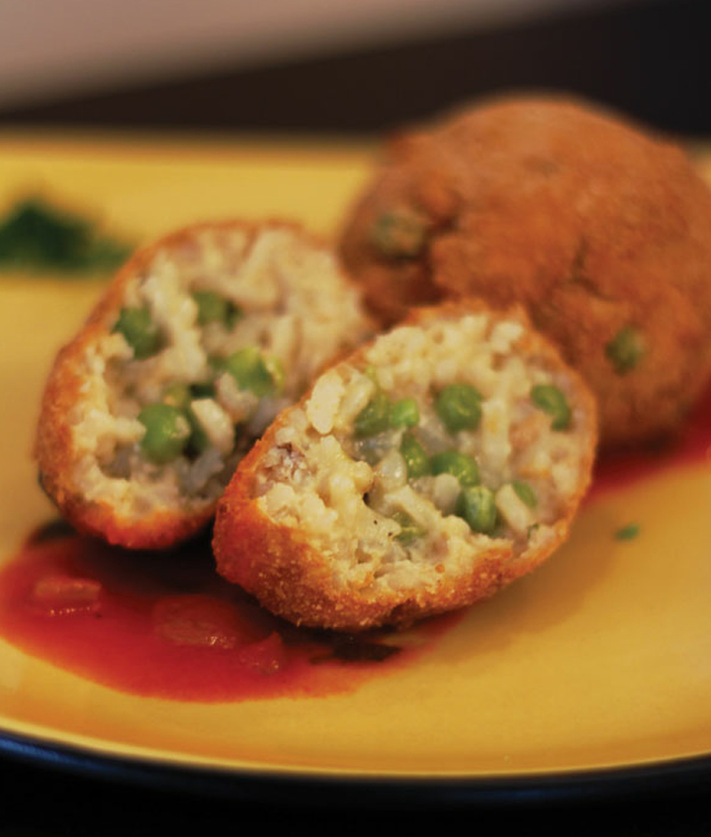 - In a large bowl, combine the cooked rice, peas, and Parmesan cheese. Stir together and form eight rice balls of equal size, about three inches in diameter. Set aside.