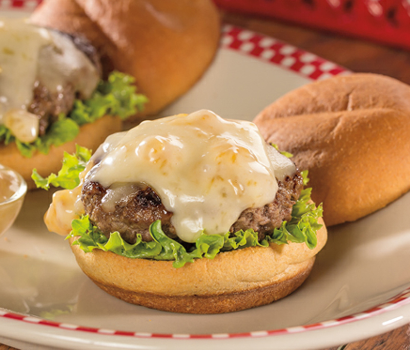 - If desired, place a piece of cheese on each slider about 2 minutes before burgers are finished cooking. When done, place each patty on a toasted roll and top with peach mayonnaise.