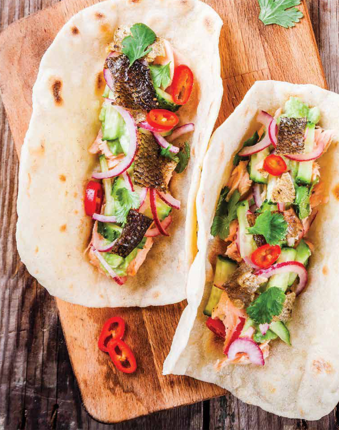 Smoke-roasted salmon is perfect for fish tacos because of its tender texture and smoky flavor. Jicama in a fresh-fruit salsa adds crunchy texture.