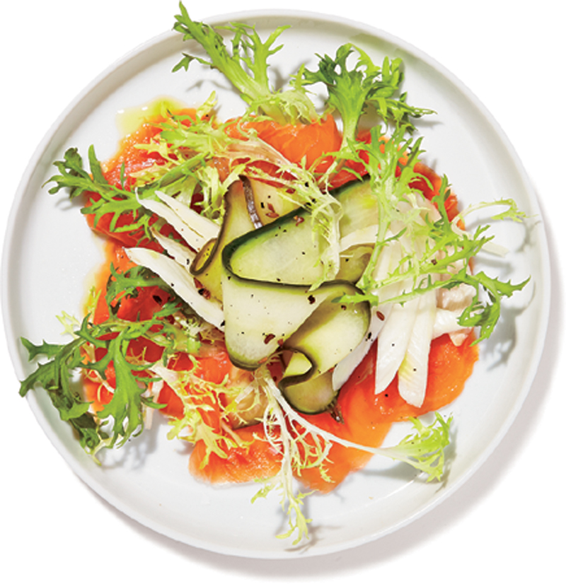 - Top the smoked salmon with the frisée and pickled vegetables. Serve with a drizzle of olive oil and sea salt.