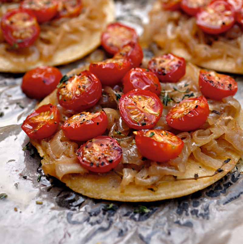 - To serve, spread the onion over the pancakes; they should be totally covered. Arrange tomato halves on top. Place in the oven to warm up for about 4 minutes. Serve warm, with crème fraîche on the side.