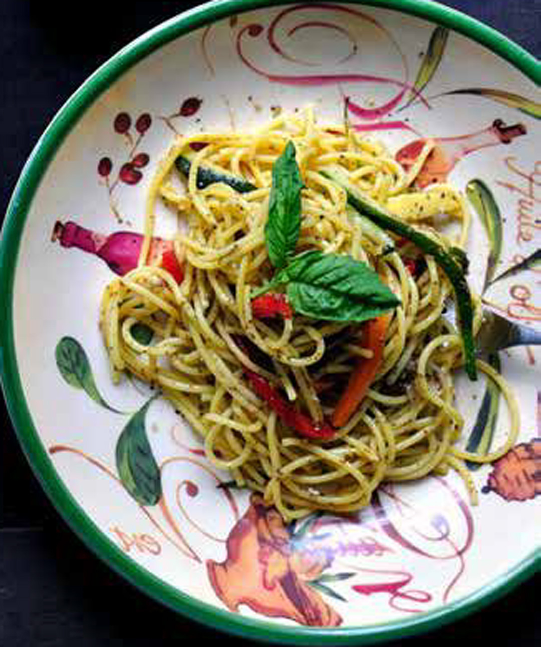 This light, flavorful dish combines spaghetti, zucchini, and roasted red peppers in a light white wine-olive-oil sauce.