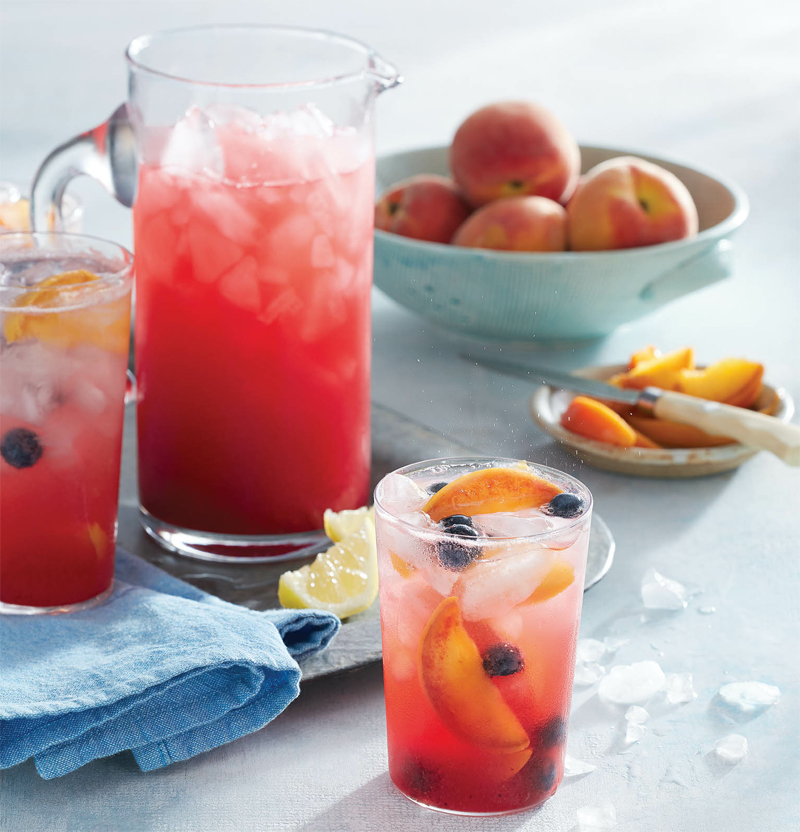 - Using the back of a spoon, press and strain pulp through a fine-mesh sieve into a clean bowl. Discard pulp. Pour the liquid into a pitcher and add lemon juice and sparkling water. Serve lemonade in glasses over ice. Garnish with peaches, blueberries, lemon, and mint.