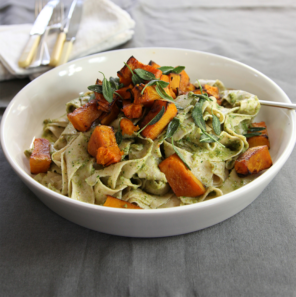 - Bring a large saucepan of salted water to the boil. Add the pasta and stir to separate the strands, then cook for 6–8 minutes or until al dente. Drain and return to the pan, then drizzle with a little olive oil and toss to coat. Do not run it under water. Toss the walnut sauce through the hot pasta, then place the pasta in a large serving bowl. Top with the roasted pumpkin, crisp sage leaves, remaining toasted walnuts and feta, if using, and serve immediately.