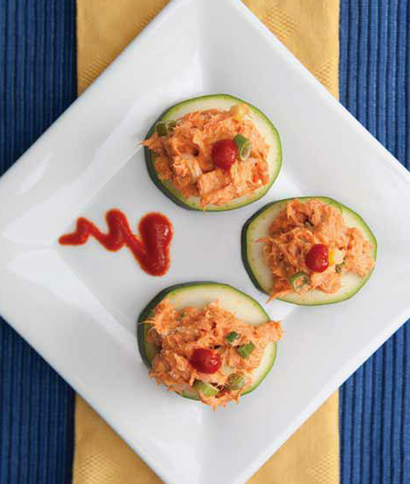 - Gently mix in avocado (if desired) and spoon onto cucumber rounds. Serve immediately.