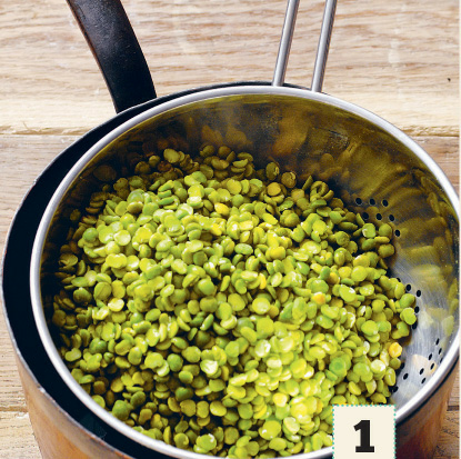 Rinse the peas under cold running water. Put them in a saucepan and cover with water. Bring to the boil and boil for 3 minutes, skimming off any foam from the surface, if necessary. Drain the peas.