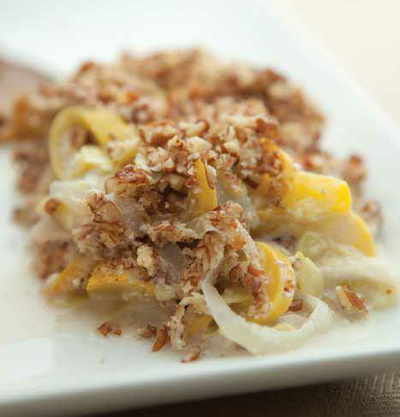 In the South, squash casserole is most often made with loads of cream, and topped with Ritz crackers for crunch. Some recipes call for adding cream of chicken or mushroom soup to give the casserole that creamy flavor and texture. With this variation, coconut milk makes a great substitute for the cream, and the pecans add a fantastic crunch that is sure not to disappoint!