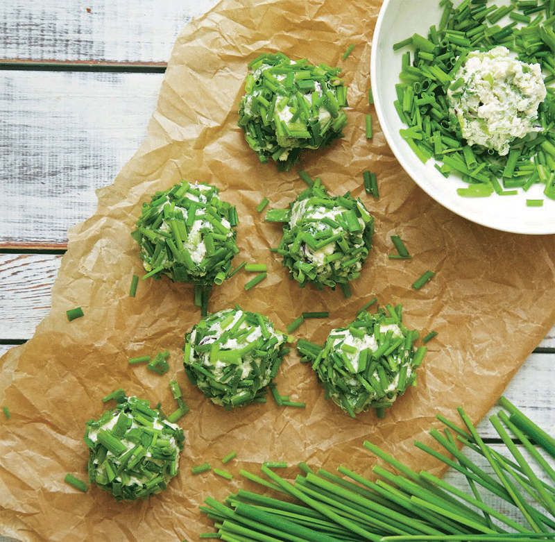 - Using a large spoon or an ice cream scoop, divide the mixture into six balls. Roll each ball in the chopped chives and place on a plate. Enjoy immediately or refrigerate in an airtight container for up to 5 days.