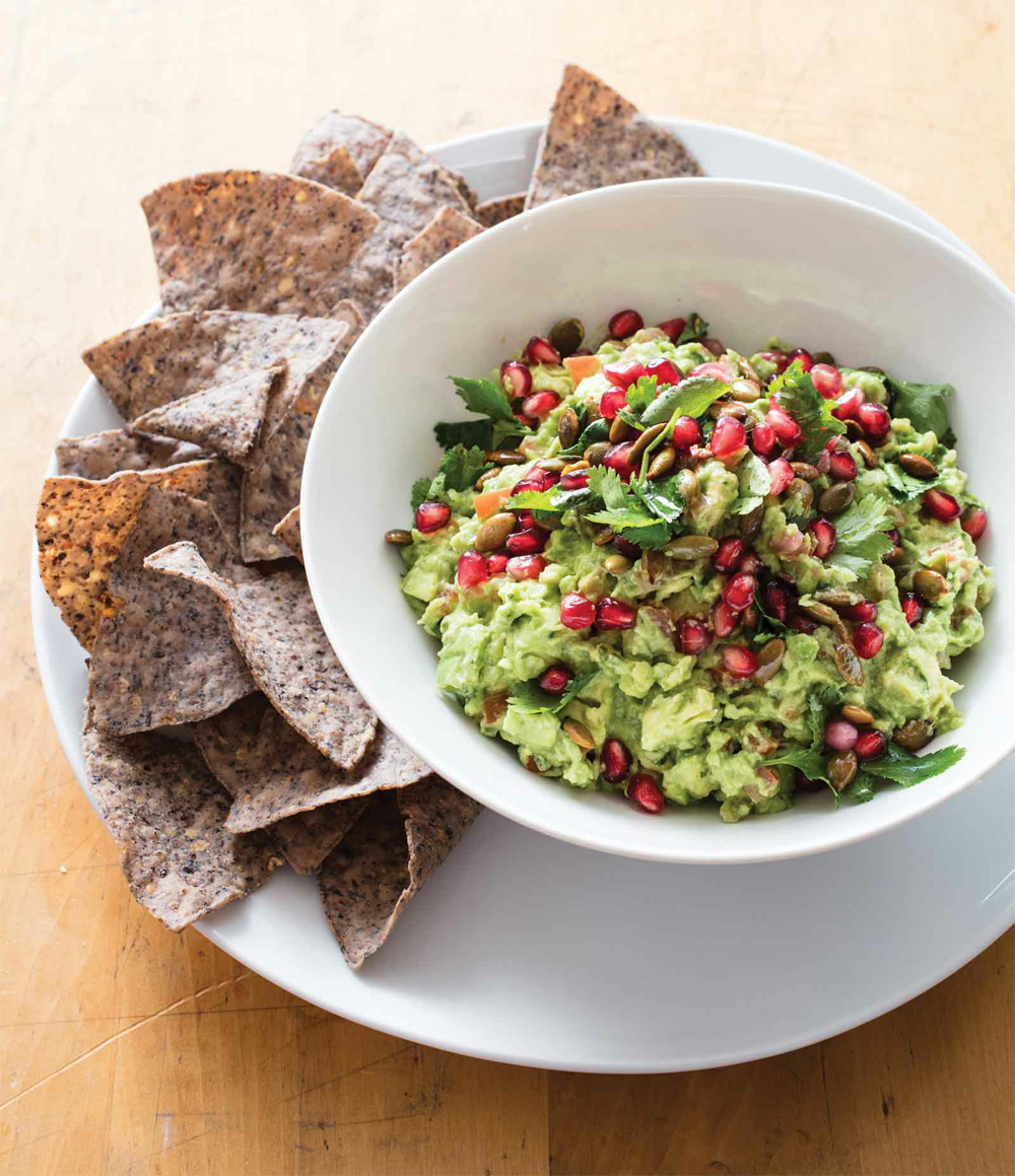 - Toss pomegranate-pepita mixture with oil and remaining ½ teaspoon lime juice. Transfer guacamole to serving bowl and top with pomegranate-pepita mixture. Serve.