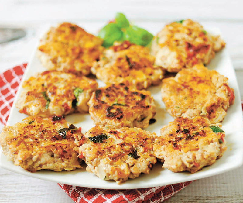 - In a medium bowl, combine the chicken, onion, sundried tomatoes, basil, garlic, salt, and pepper until well combined. To form sliders, take a spoonful of the mixture and pat together a patty that is 2 to 3 inches (5 to 7.5 cm) in diameter.