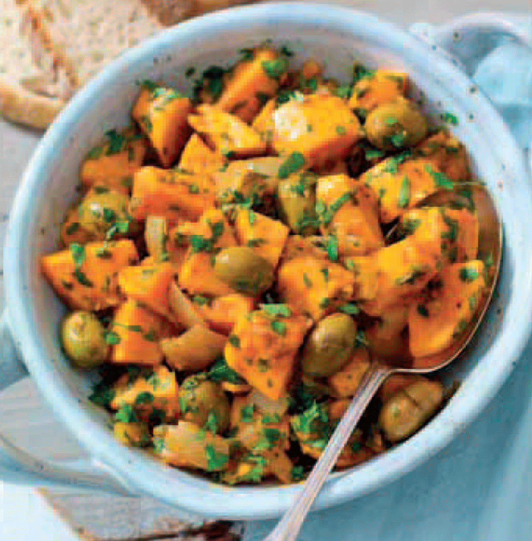 In Morocco and Tunisia, sweet potatoes are often cooked in tagines, combined with herbs and spices, and served as a side dish or salad. The combination of green olives and preserved lemon is typically Moroccan.