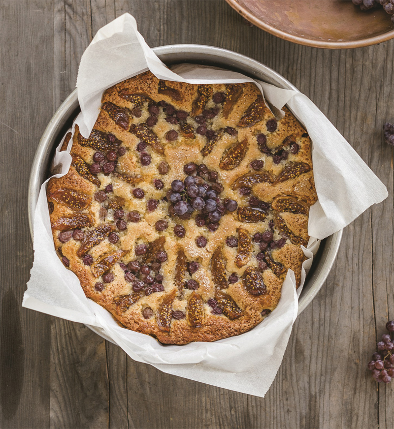 - Transfer the batter to the prepared cake pan. Arrange the figs and grapes on the surface and sprinkle the fruit with sugar. Bake the cake until the surface has set and the color has just begun to brown, about 20 minutes. Rotate the cake and continue to bake until a cake tester inserted into the center comes out clean, about 30 minutes more. Let the cake cool to warm room temperature before removing it from the pan. Serve it with freshly whipped cream, if desired. This cake keeps well in a sealed container at room temperature for up to 2 days.