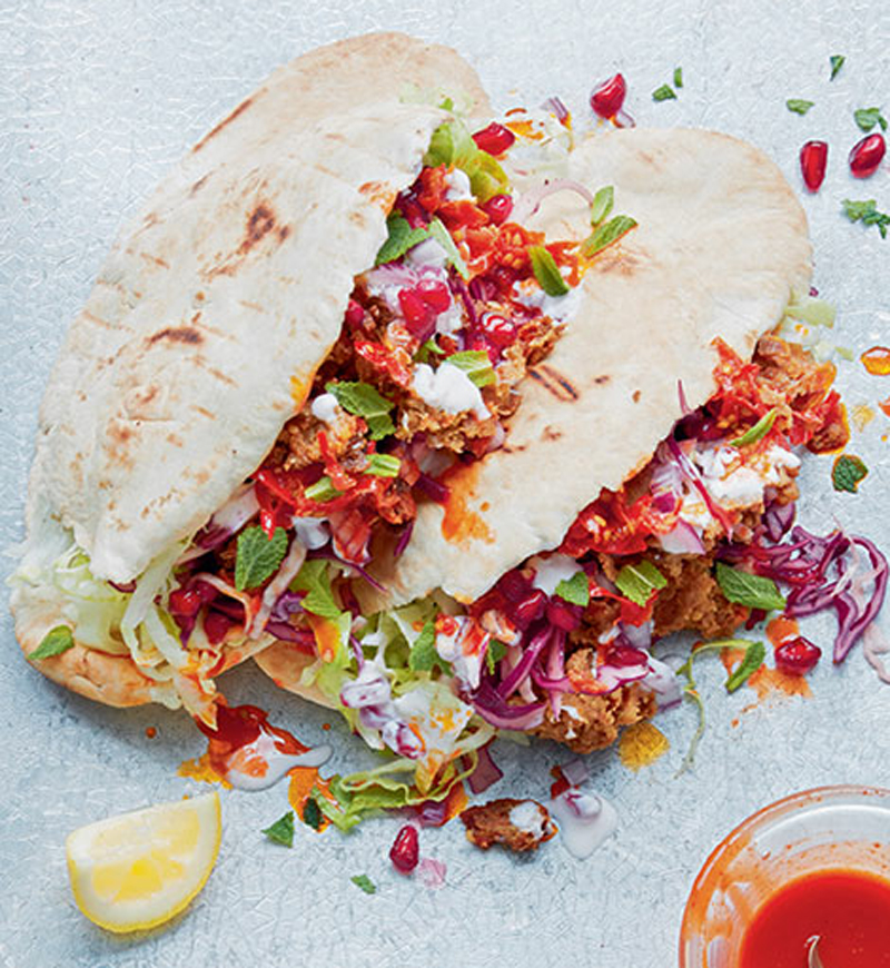 - Place the pittas into a medium oven or toaster and lightly brown for a few minutes. Slice open and fill with slaw as desired. Add generous layers of sliced ‘doner meat’, and slather with drizzles of pomegranate yogurt sauce. Scatter with a few mint leaves, pomegranate seeds and a drizzle of hot pepper sauce if you like. Serve immediately with napkins.