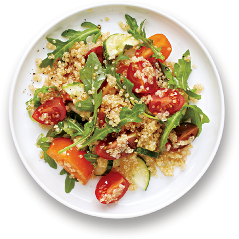 - Whisk together the oil, vinegar, ½ teaspoon salt, and ¼ teaspoon pepper. Add the quinoa, tomatoes, cucumber, and arugula and toss to combine; season with ¼ teaspoon each salt and pepper.