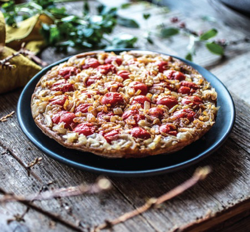 - Roll the dough out between two sheets of parchment until it is 1 inch larger than the skillet, then carefully drape it over the tomato mixture. Cut off any excess crust, leaving an edge of ¼ inch. Fold this inward and crimp all the way around to form a decorative rim of crust. Cut a few decorative slits in the crust to release steam. Bake on the center rack of the oven until the crust is deeply golden and the tomatoes are bubbling, 25 to 30 minutes. Cool for about 5 minutes. Run a sharp knife around the rim of the skillet to loosen the crust. Place a plate that is slightly larger than the skillet over the tatin and carefully invert it onto the plate (replacing any tomatoes and onions that might stick on top). Serve warm, sliced into wedges. You may also serve the tatin right from the skillet, slicing it into wedges.