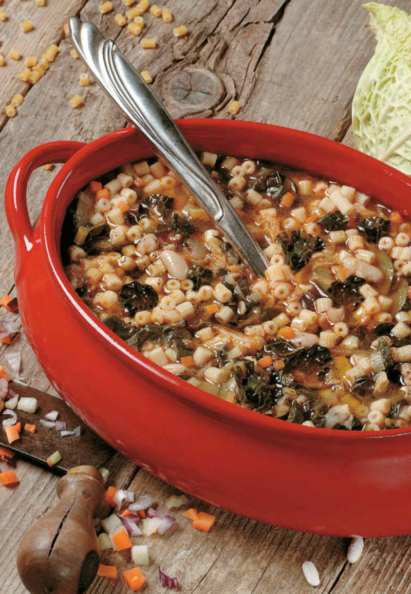 - Add the beans, the rice or pasta, and cook until the rice or pasta is tender. Add more liquid if necessary. Set aside to rest for a couple of minutes before serving. Serve the minestrone hot, sprinkled with grated cheese and a grinding of pepper.