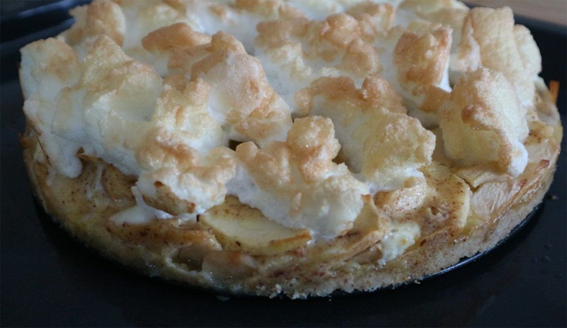 - When the mixture is ready spoon it over the apples pie and bake the pie for 30 min. more.