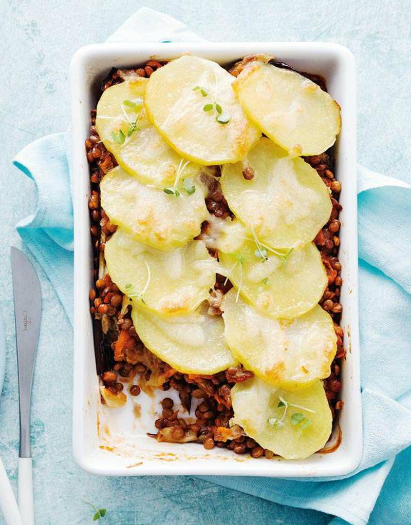 - Arrange the potato slices over the lentil mixture and sprinkle over the grated cheese.