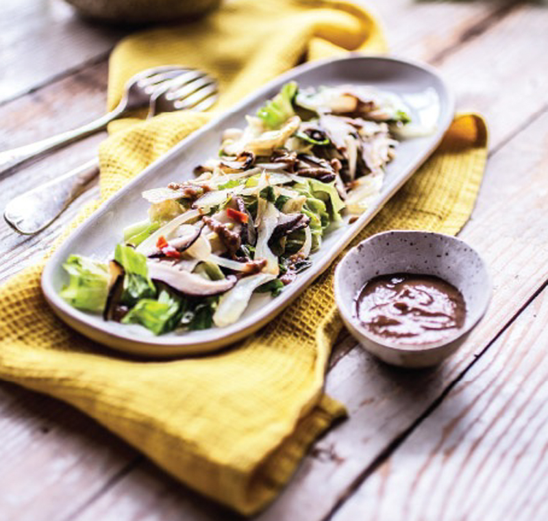 - Heat the oil and onion in a deep skillet over medium heat. When the onion begins to sizzle, add the chili powder and a pinch of salt and cook, stirring, until translucent, about 2 minutes. Add the shiitakes and another pinch of salt, followed by the white wine. Cover and cook for 3 to 4 minutes. Add the escarole, season lightly with salt, and sauté until wilted and deep green, 3 to 4 minutes. To make the Dressing